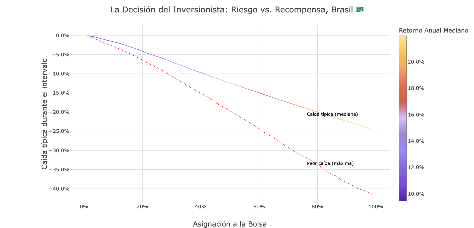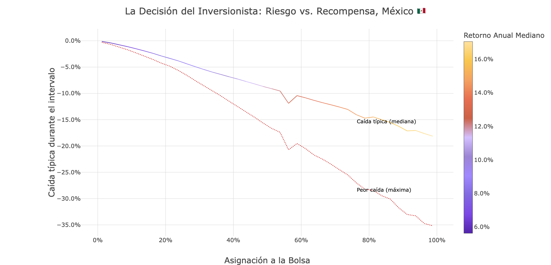 Eje Y: La caída potencial en el valor de tu portafolio. La línea sólida es la caída típica en una desaceleración; la línea punteada es el escenario de crisis del peor caso.