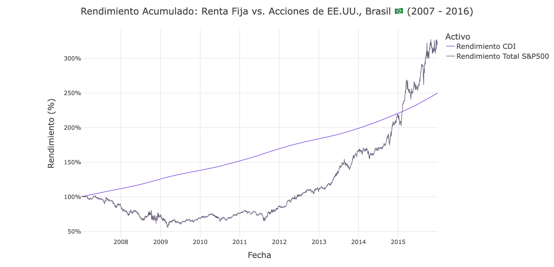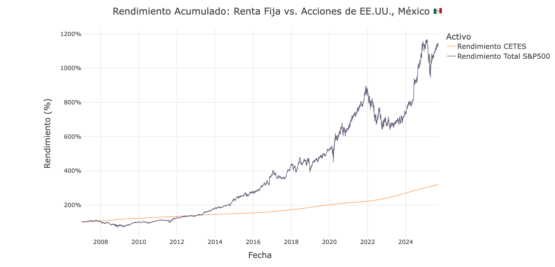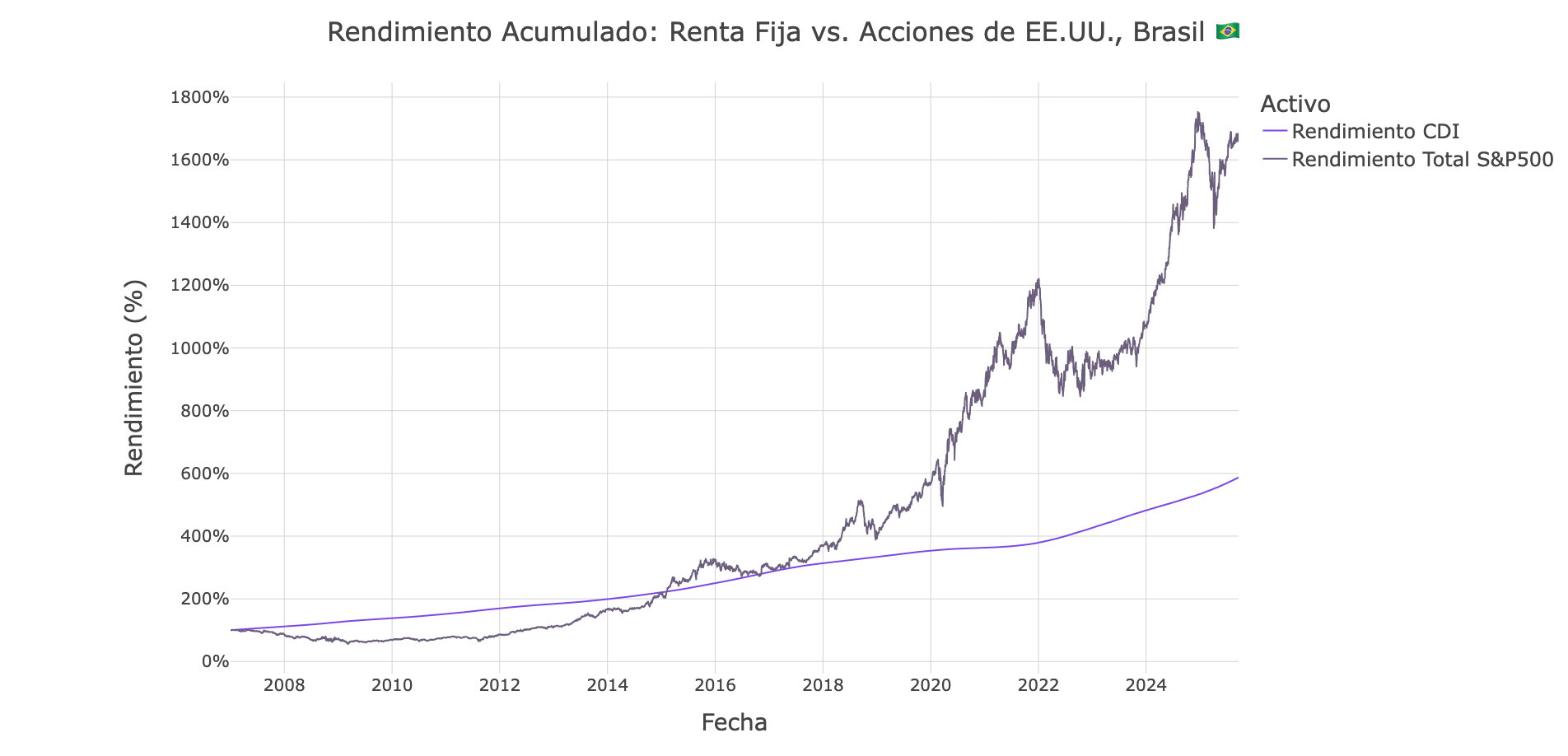 Las acciones estadounidenses han entregado rendimientos extraordinarios para inversionistas latinoamericanos, generando más de 1,600% para brasileños y casi 1,200% para mexicanos desde 2007, superando decisivamente a los bonos locales.