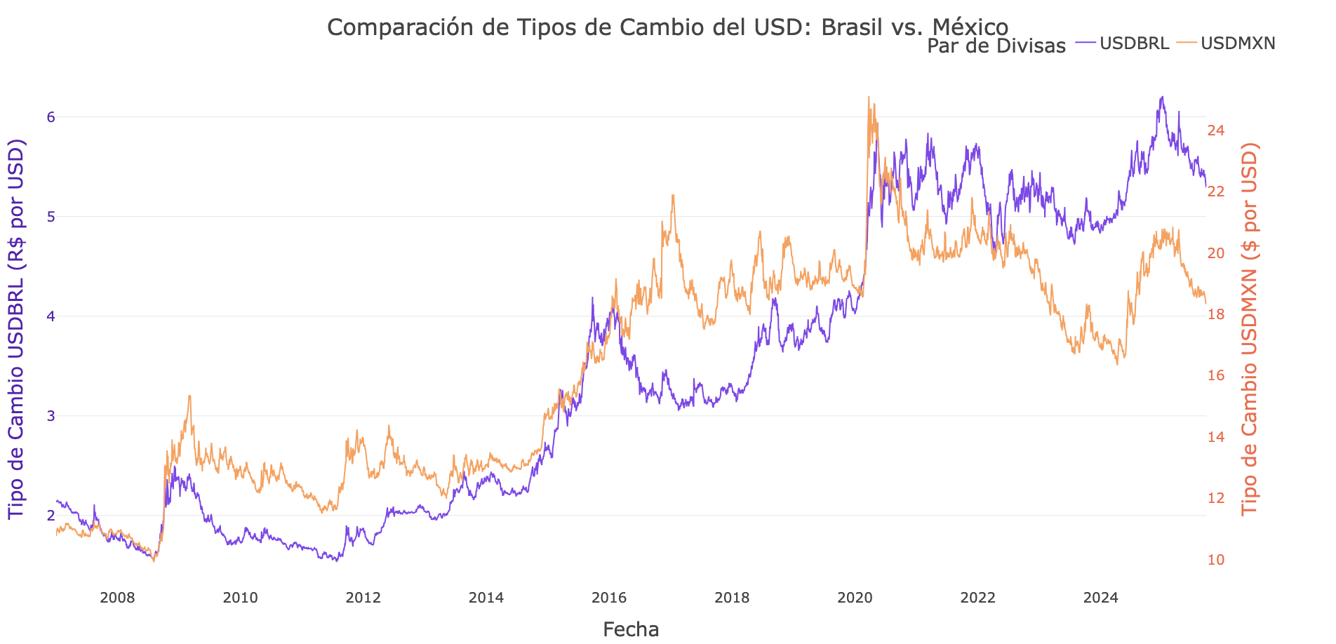 Para un inversionista brasileño o mexicano, poseer acciones estadounidenses también es una posición en el dólar estadounidense, que se ha apreciado sustancialmente durante el período de estudio. Más recientemente, desde COVID, el peso básicamente ha quedado parejo contra el dólar, mientras que el real brasileño se depreció considerablemente: