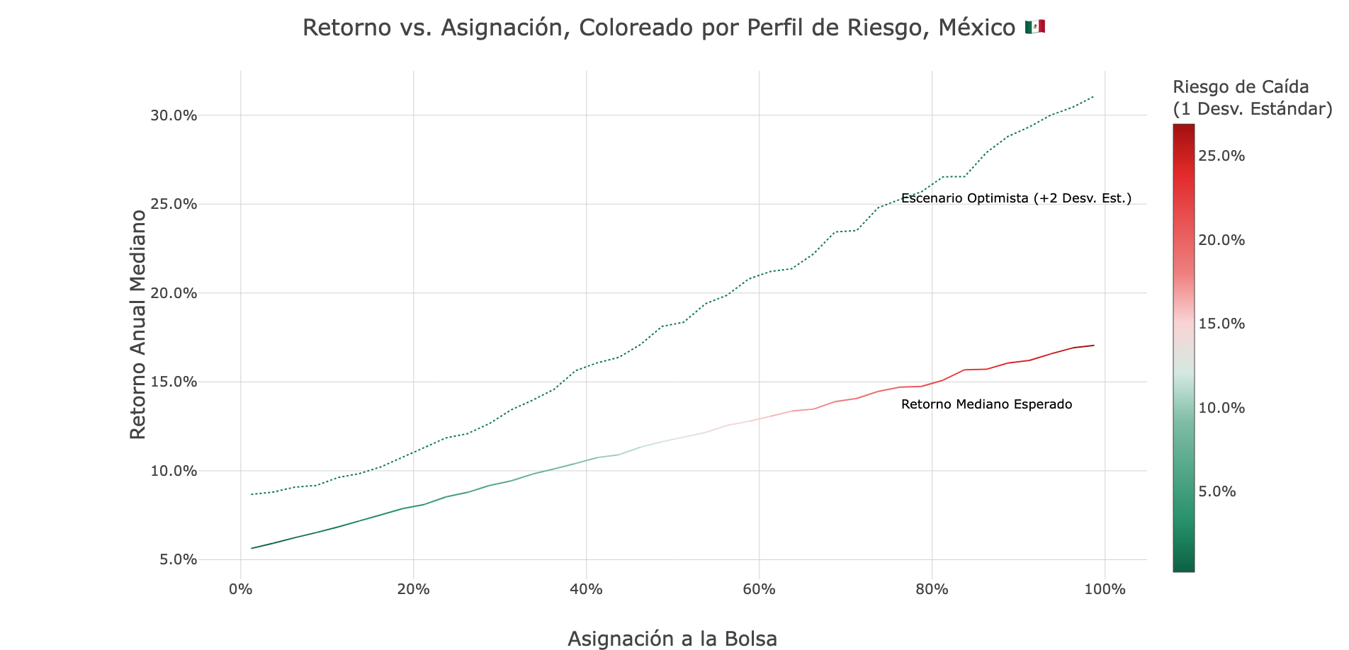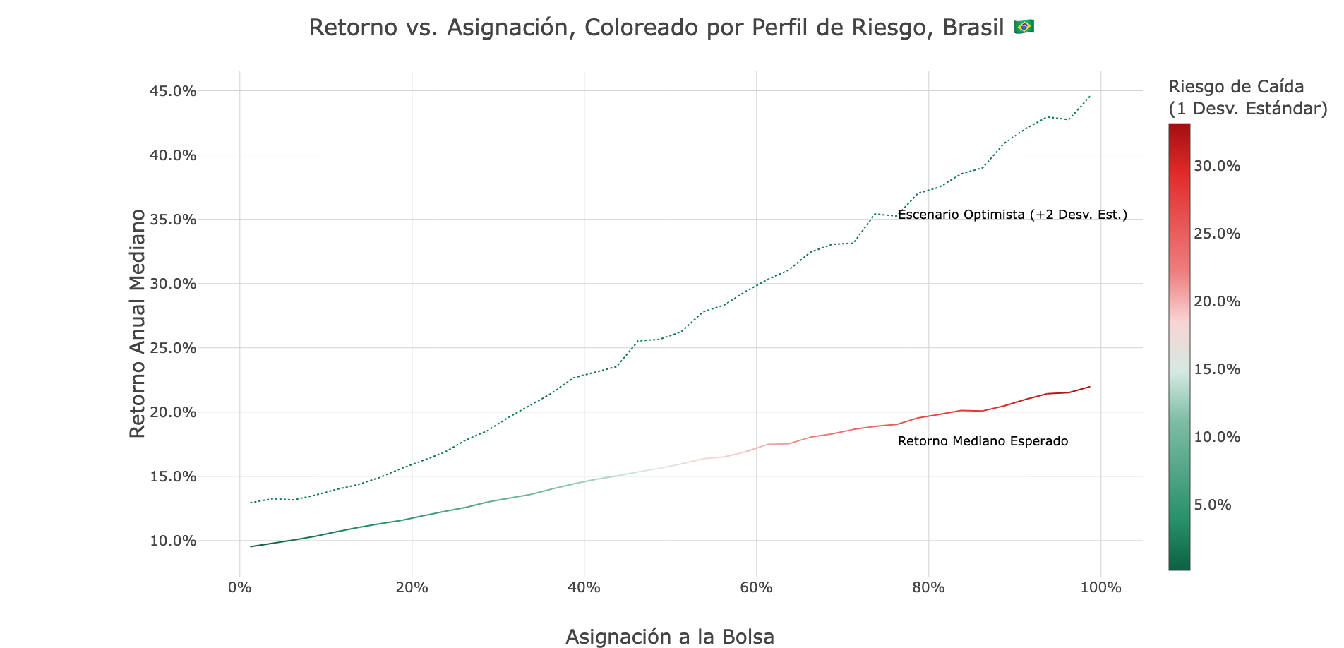 Esas gráficas se enfocan en el riesgo. Podemos reformular el análisis para hacer mucho más clara la relación entre la asignación en el mercado de valores y el desempeño del portafolio. Estas gráficas muestran: