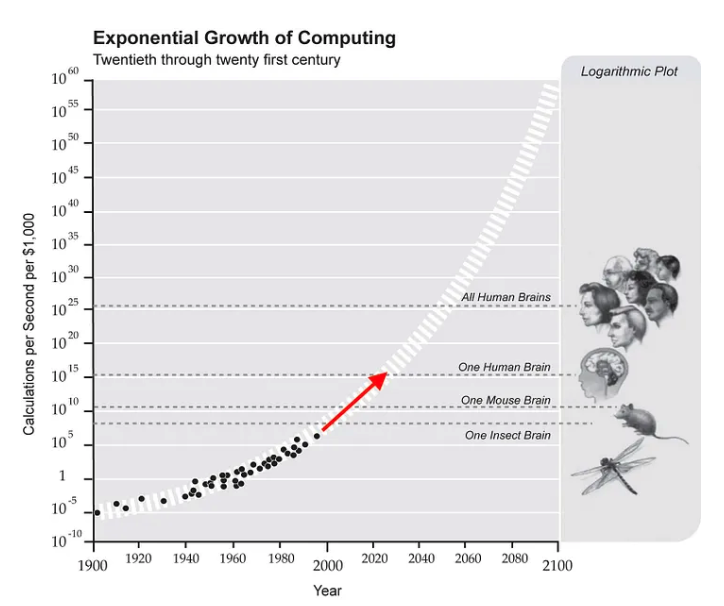 Considera este gráfico de The Singularity is Near, que muestra el crecimiento exponencial en la cantidad de cálculos que se pueden realizar por segundo con $1,000 desde el inicio de la computación digital. Kurzweil publicó el libro en 2005, y la flecha roja es mi propia anotación, trazando una línea hasta el día de hoy.