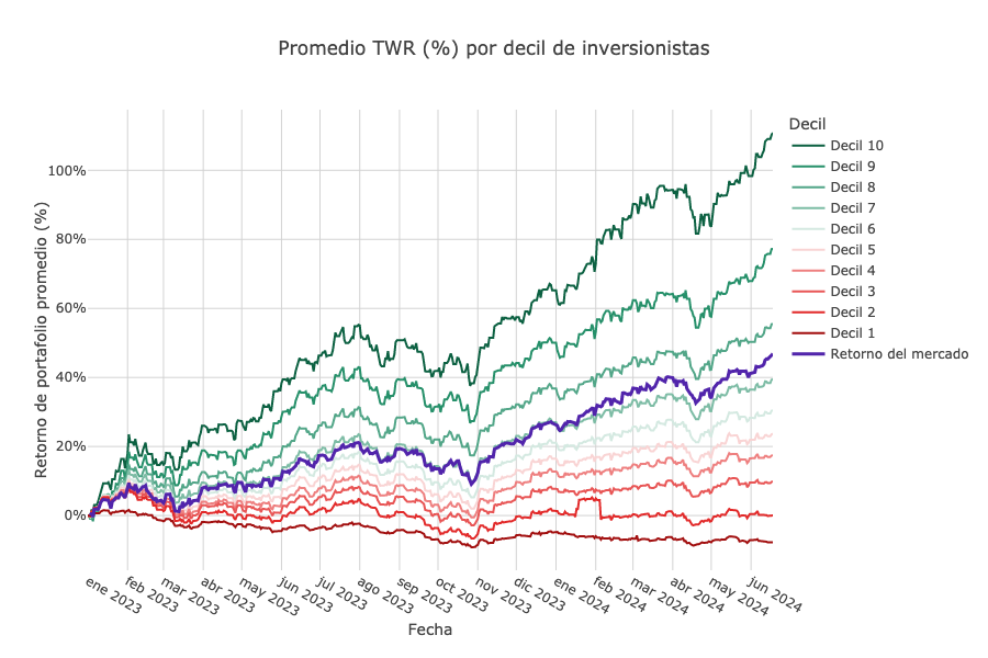Al 14 de junio, el 10% superior de los inversionistas en Vest tuvo un rendimiento del 110%, superando al mercado (45% de rendimiento) en un 65% durante casi 18 meses. Por otro lado, el 10% inferior ha perdido un 8% en el mismo período, perdiendo frente al mercado por un 53%.