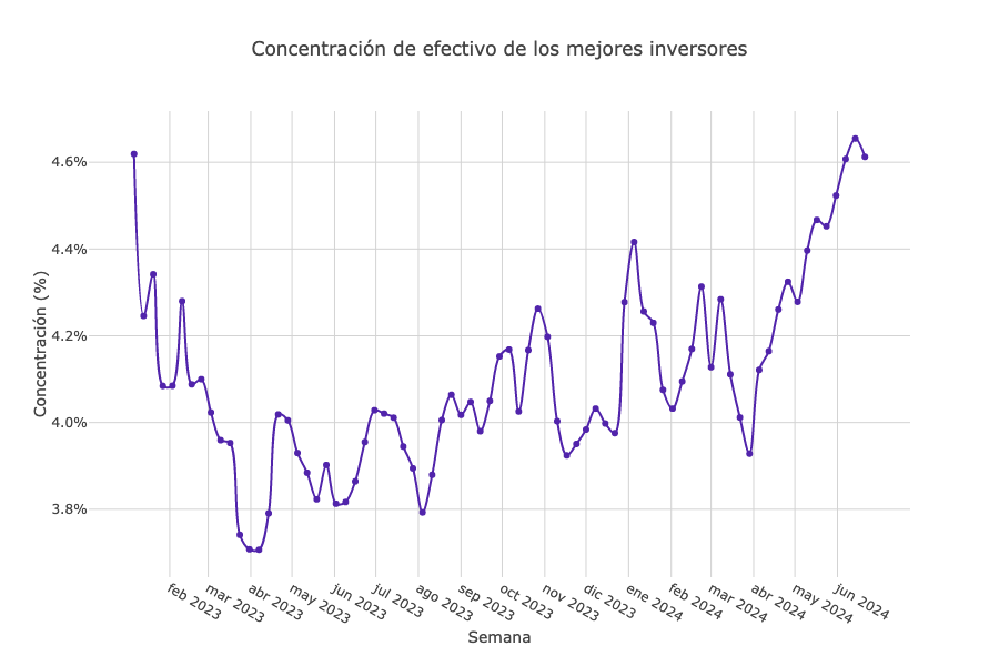 El efectivo representa una parte significativa de los activos, con ~5% de la concentración, ya que mientras el mercado continúa subiendo, algunos inversionistas han decidido aumentar su porcentaje en efectivo. Durante los últimos 18 meses, el efectivo para el 10% superior de los inversionistas ha oscilado entre el 3.7-4.9% de la cartera total, con varias fluctuaciones. Una tendencia interesante es que, a partir de abril, la concentración de efectivo ha comenzado a aumentar y continúa haciéndolo, alcanzando niveles no vistos desde principios de 2023.
