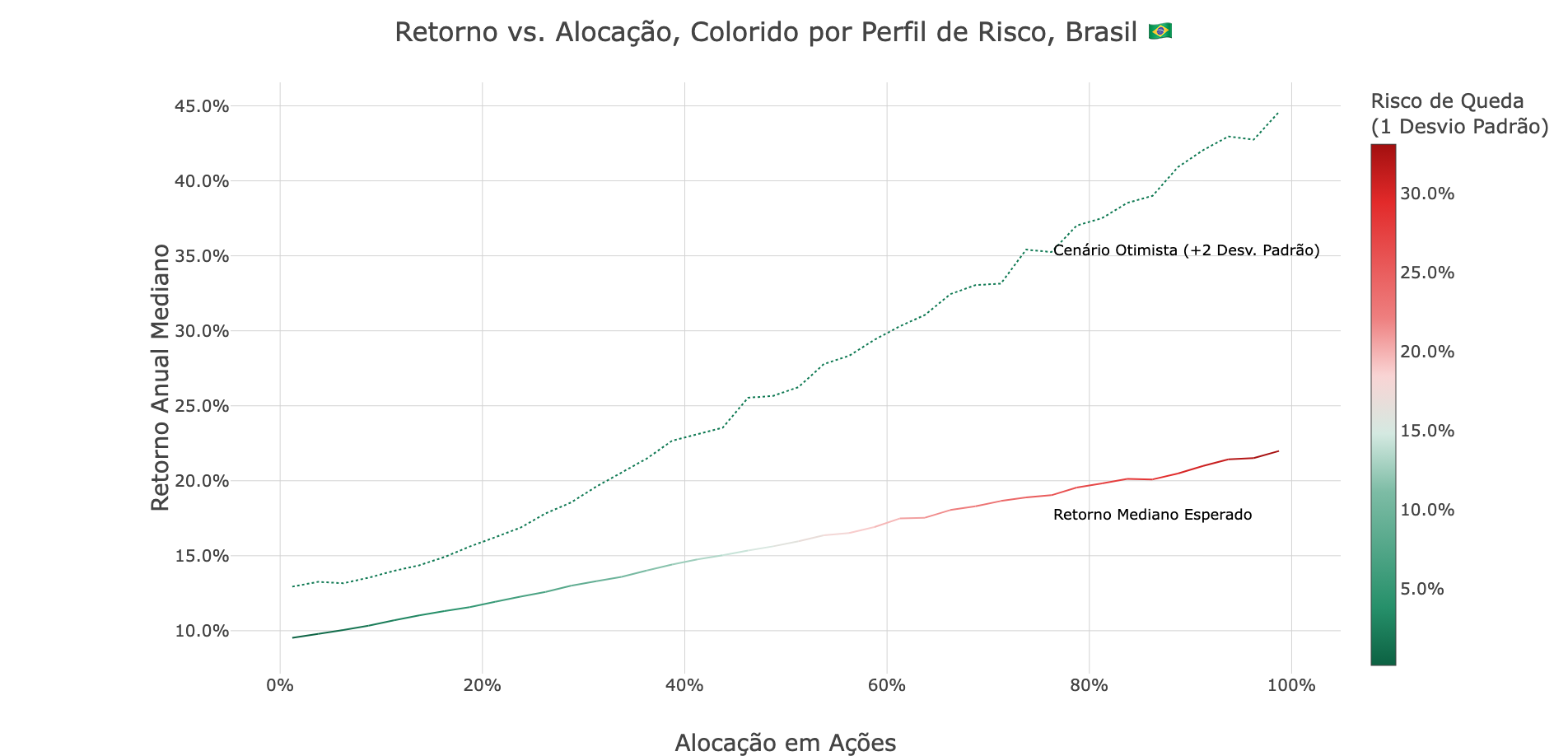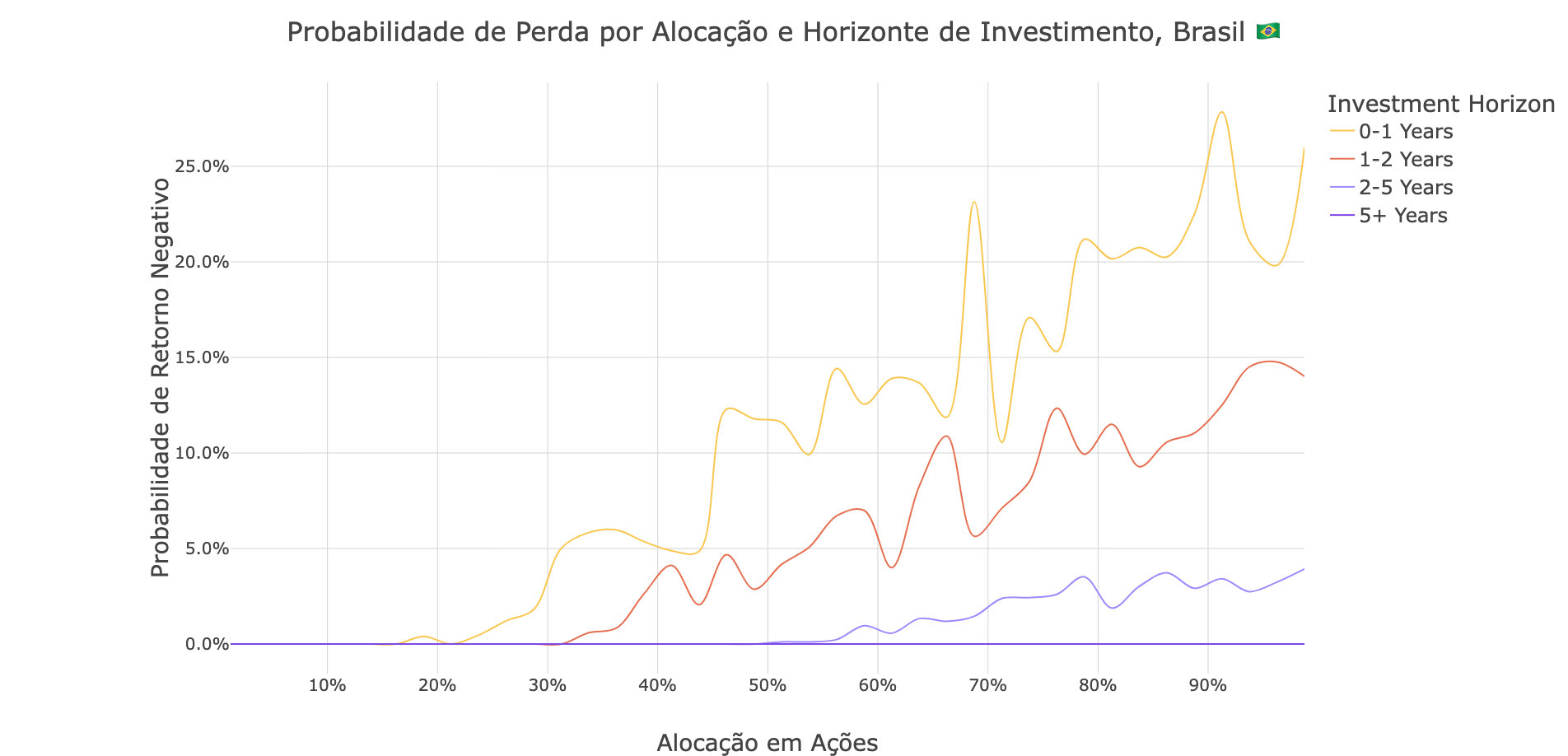 O passado não necessariamente prevê o futuro, mas é o melhor que temos para trabalhar se quisermos tomar decisões baseadas em dados. Para entender as relações entre horizonte de investimento, volatilidade e retorno, rodamos 100.000 simulações para cada mercado, escolhendo aleatoriamente diferentes intervalos de tempo dentro da janela completa de 18 anos e estudando como carteiras com diferentes combinações de ações e renda fixa local se comportaram.