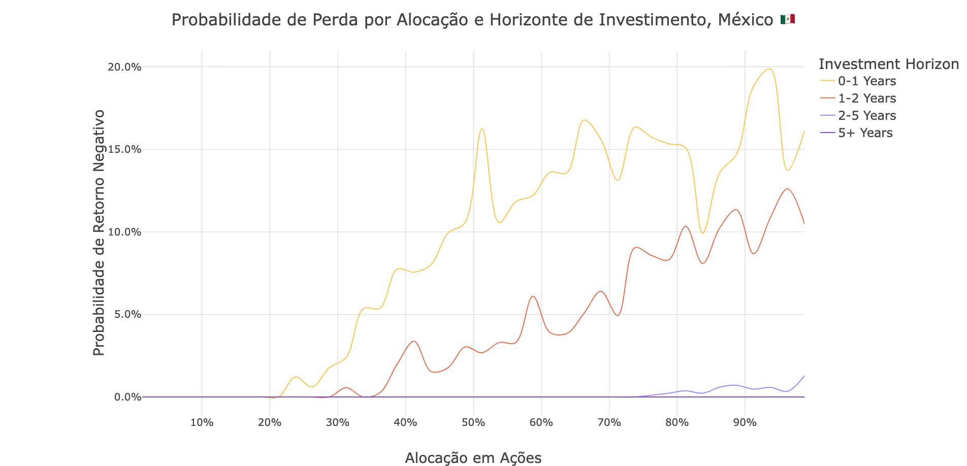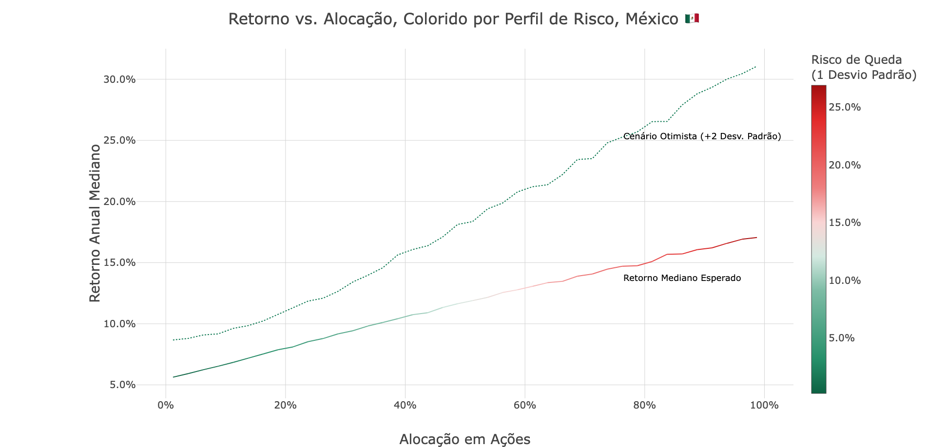 Esses gráficos geralmente contam a mesma história: mais risco, mais retorno. O insight chave, no entanto, é que mesmo uma quantidade muito pequena de alocação em ações americanas cria muito espaço para surpresas positivas: com apenas 1,2% de alocação em S&P500, o retorno previsto da carteira brasileira variou entre 9,5% e 13,1%. No México, variou entre 5,6% e 8,6%.