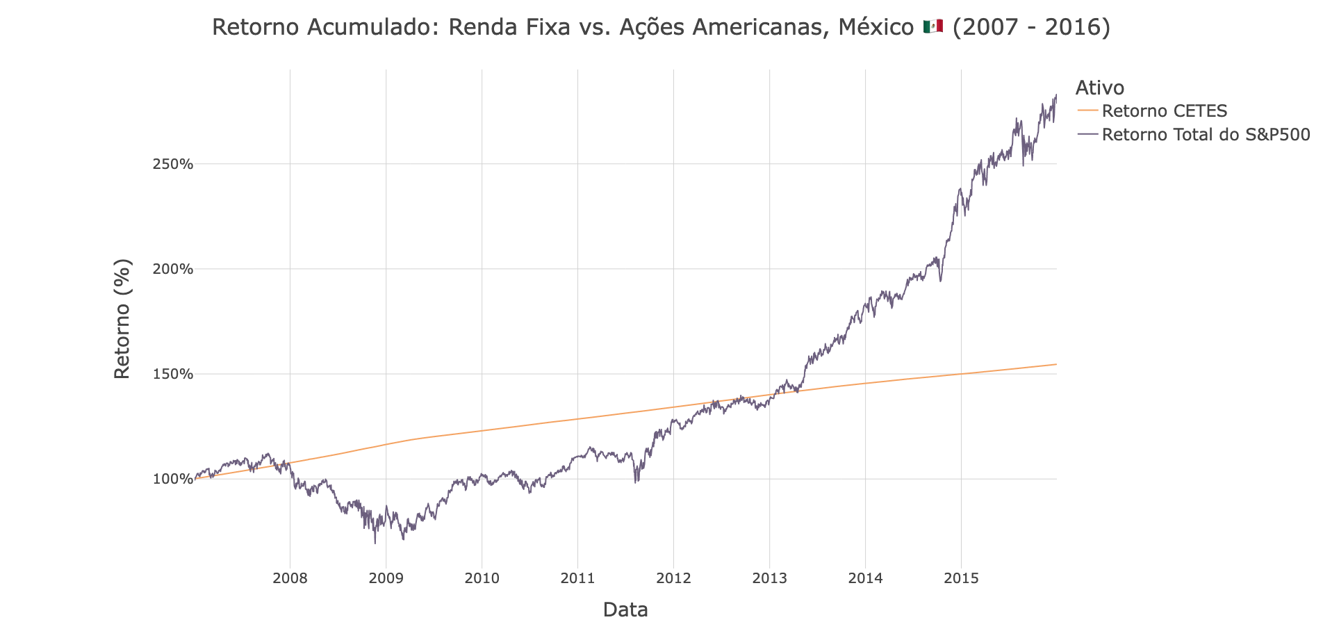 Então por que não apostar tudo em ações americanas? Porque mesmo que elas geralmente tenham subido, elas também podem cair. De 2007 a 2014 – por um período de 7 anos – investidores mexicanos e brasileiros teriam ficado melhor, em grande parte, mantendo-se na renda fixa: